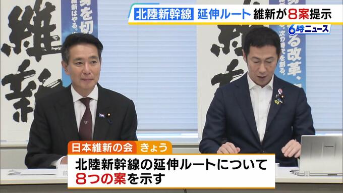 ルートが定まらない北陸新幹線の延伸。維新が8パターンの案を提示しました。 (日本維新の会 前原誠司顧問)「もう一度考えられる全てのルートをそ上に載せて、一つ一つ検討していく」 日本維新の会は12月2…