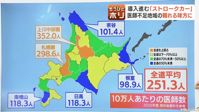 こうした取り組みが求められる背景のひとつが道内の『医師の偏在』です。人口10万人当たりの医師の数は、札幌圏と、旭川を含む上川中部圏に集中しています。全道の平均が250人ほどですが、根室や宗谷地方などは、平均の4割ほどと、医師不足が顕著になっています。