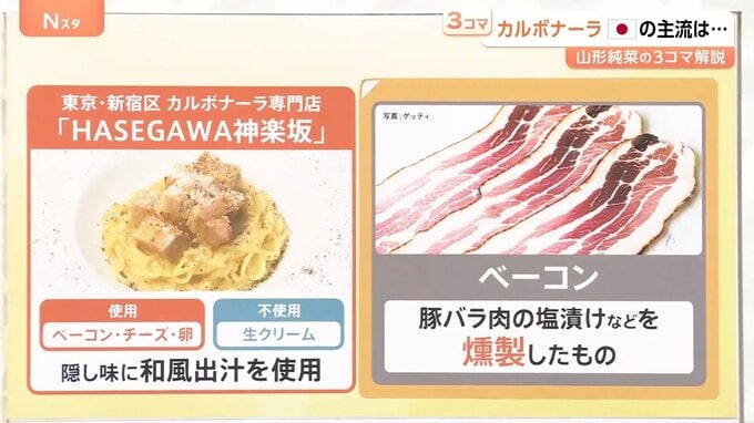 今回取材した、東京・新宿区カルボナーラ専門店「HASEGAWA 神楽坂」のカルボナーラではベーコン・チーズ・卵が使用されています。生クリームは使っていないそうで、隠し味に「和風出汁」を使用しているということです。