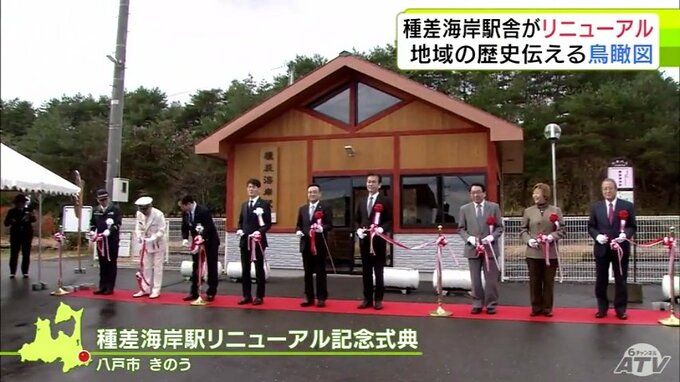 JR八戸線の種差海岸駅で工事が行われていた駅舎がリニューアルしました。天井には鳥瞰図(ちょうかんず)が装飾されるなど、地域の歴史と文化が感じられるつくりとなっています。1日は、種差海岸駅にJRの関係者など…