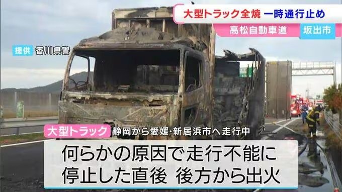 消防によりますと、きょう午前6時5分ごろ、高松自動車道で運転手の男性から「トラックが燃えている」と通報がありました。