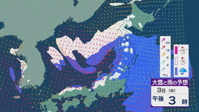 この先の雪・雨と風の予想ですが、3日は午後から山陰から北陸、東北の日本海側などで雪が降るでしょう。