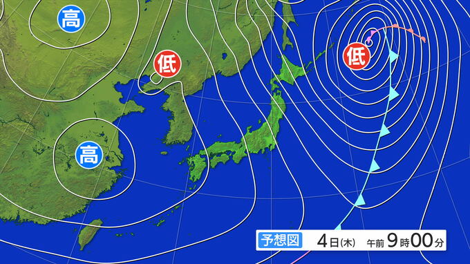 【画像①】はきょう(3日)午後9時、【画像④】はあす(4日)午前9時の予想天気図です。