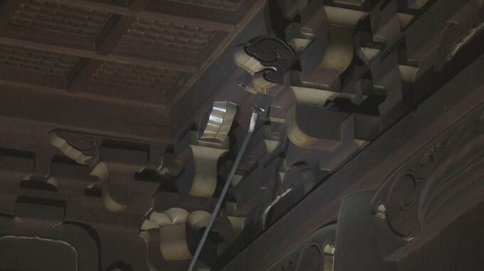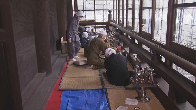 本殿では、仏具を運び出して1つ1つ布で磨いたり、欄間や柱などに積もったほこりを機械で吹き飛ばしたりなど、隅々まできれいにしました。高さ3.8メートル、幅3.4メートルの大提灯も笹で丁寧に払われました。
