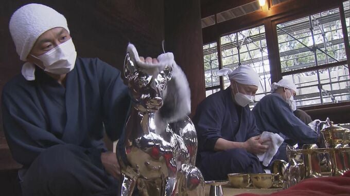 12月3日午前8時前から始まった豊川稲荷の「大すす払い」。例年150万人ほどが訪れる初詣を前に、気持ちよく参拝してもらえるよう僧侶と職員約110人で行われました。