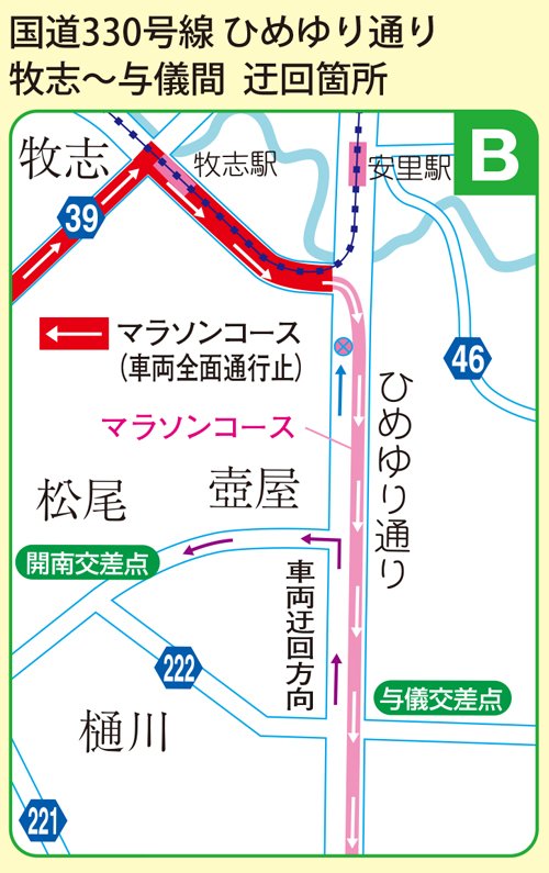 第39回 NAHAマラソン 交通規制・競技中止勧告時間・リタイアバス待機場所をガイド【規制地図あり】 琉球放送 2025年12月3日(水) 11:30 国内 交通規制【B地点】 ◆久茂地交差点→国際通り→モノレール牧志駅→ひめゆり通り→古波蔵交差点 規制時間:午前8時30分~午前10時45分頃(予定) ※久茂地交差点→国際通り→モノレール牧志駅(市道)間は全面規制