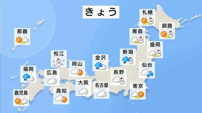 きょうは太平洋側の地域も雲が多く、名古屋や高知では雪が舞う所もありそうです。東京は弱い雨のぱらつく時間帯もあるでしょう。きょうは折りたたみ傘があると良さそうです。