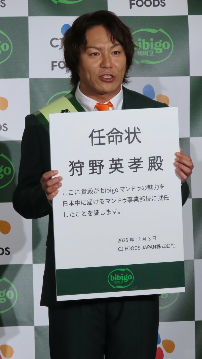 お笑い芸人の狩野英孝さんが3日、『CJ FOODS JAPAN bibigo マンドゥ事業部 狩野英孝部長就任発表会』に登場。人気商品『bibigo マンドゥシリーズ』に特化した事業部が設立されるにあたり、狩野さんが〝マンドゥ事業部長〟に就任しました。