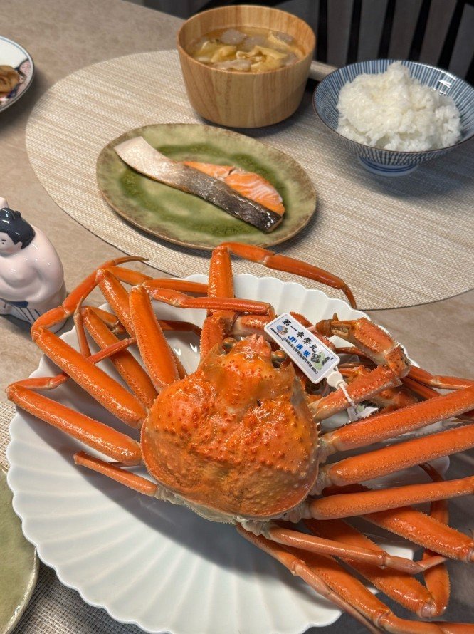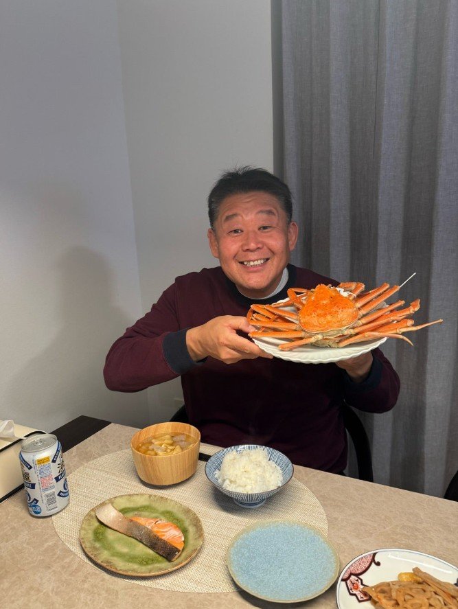 ブログに掲載された写真には、赤い松葉ガニを両手で掲げ、満足そうな笑顔を見せる花田さんの姿が写っています。テーブルの上には白いご飯や焼き魚、味噌汁といった和食の数々が並び、豪華な食卓の様子がうかがえます。
