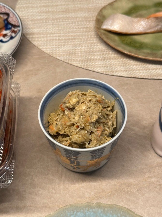 また別の写真では、オレンジ色の鮮やかな松葉ガニが皿に盛られている様子や、野菜の和え物など副菜の数々も確認できます。