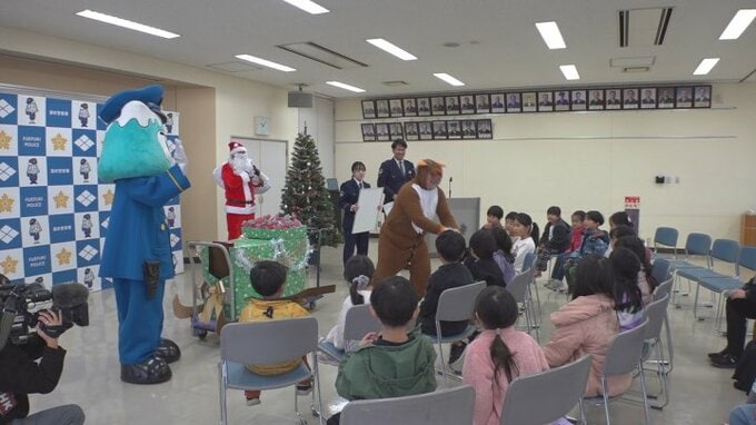 防犯教室には山梨英和プレストンこども園の年長園児22人が参加し、不審者に遭遇した時の行動をまとめた防犯標語「いかのおすし」を学びました。