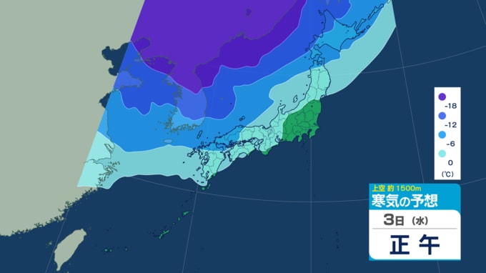 日本付近は、3日夜から4日にかけて冬型の気圧配置が強まり、関東甲信地方の上空約5500メートルには氷点下30度以下のこの時期としては強い寒気が流れ込む見込みです。