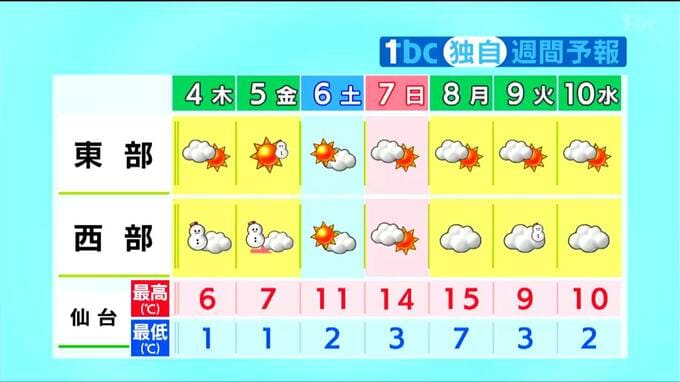 週間予報です。5日は朝にかけて東部にも雪雲が流れ込み、積もる可能性があります。その後は東部では晴れる日が多いですが、火曜日は西部で雪が降るでしょう。日曜・月曜は暖かくなりそうです。
