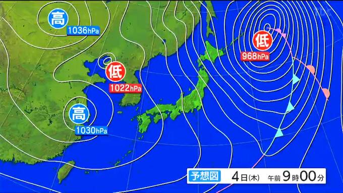 4日午前9時の予想天気図です。低気圧が北海道の東で急速に発達し、冬型の気圧配置となるでしょう。日本海側を中心に警報級の大雪となるおそれがあります。