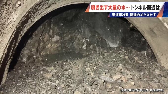 ところが、大量の水に阻まれ工事が進まず、開通にめどが立たない状態が続いているのです。NEXCO中日本が撮影した工事現場の様子。岩盤から水が噴き出し掘削作業が出来ません。