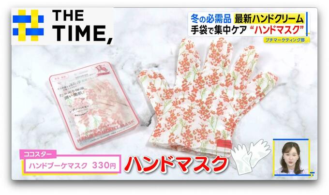 「直近1か月で“シリーズ累計9000個”ほど売れている」(ハンズ・青木さん)というのは、花柄が可愛い手袋型の「ハンドブーケマスク」(ココスター/1組・330円)です。