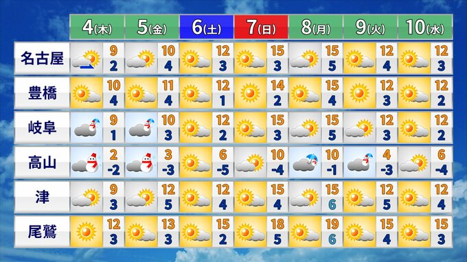 明後日金曜日は、岐阜県を中心に雪や雨が降り、名古屋にも雨雲が流れ込む時間帯がありそうです。週末は広く晴れて、お出かけ日和となる地域が多いでしょう。