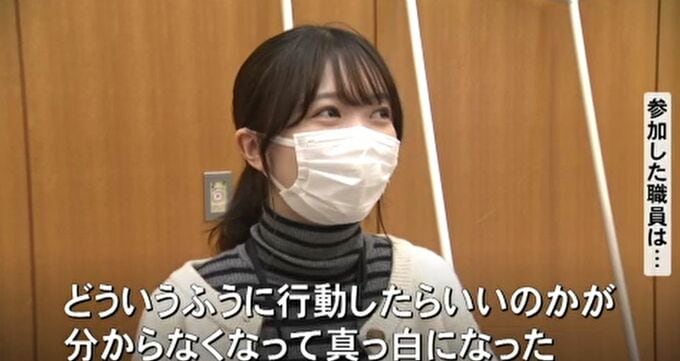 参加した職員「あまり経験したことが無いのでとにかくびっくりして緊張してしまったのでどういう風に行動したらいいのかがわからなくなって真っ白になった」「淡々と普段のテンションで詰めてきたりというのはあるので、窓口ではなくて電話口でもそういうのはあるのでそういう時に活かしたいと思う」