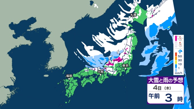 東北地方では、4日朝にかけて、雪を伴った西よりの暴風による交通障害や建物への被害に警戒してください。東北日本海側の海上では、4日明け方から朝にかけて、高波による船舶や沿岸施設への被害に警戒してください。