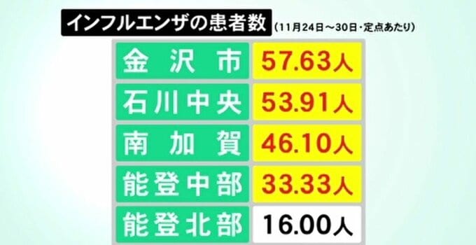 保健所管内別でみると金沢市が最も多く57.63人、次いで、石川中央が53.91人、南加賀が46.10人、能登中部が33.33人、能登北部が16.0人と、能登北部を除くエリアで警報レベルの30人を大幅に上回っています。
