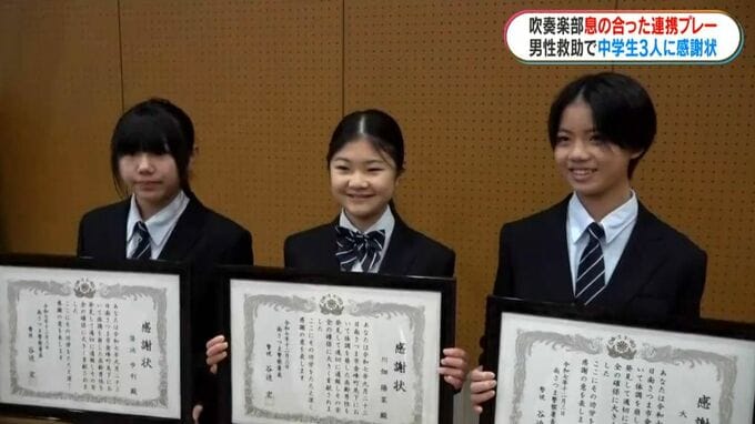 体調不良で道路に座り込んでいた高齢者を下校中に助けたとして、女子中学生3人が表彰されました。きっかけはリストバンドでした。感謝状が贈られたのは、義務教育学校金峰学園7年生の蒲池歩利さん、川畑陽菜さん、…