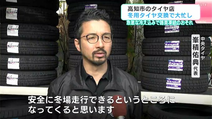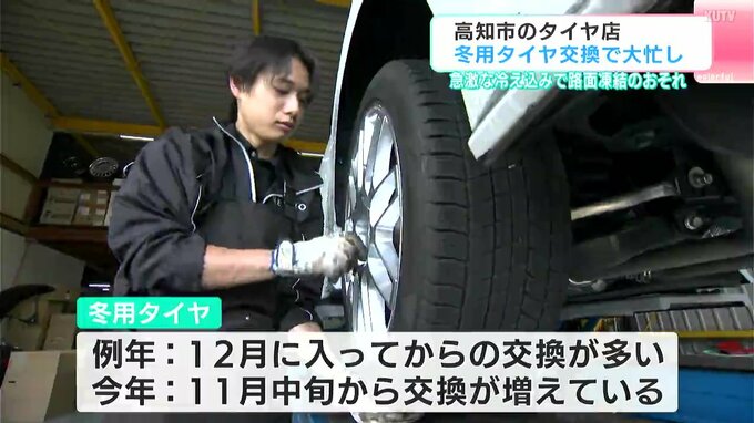 急に冷え込みが厳しくなる中、高知市のタイヤ店は、冬用タイヤへの交換作業で大忙しです。