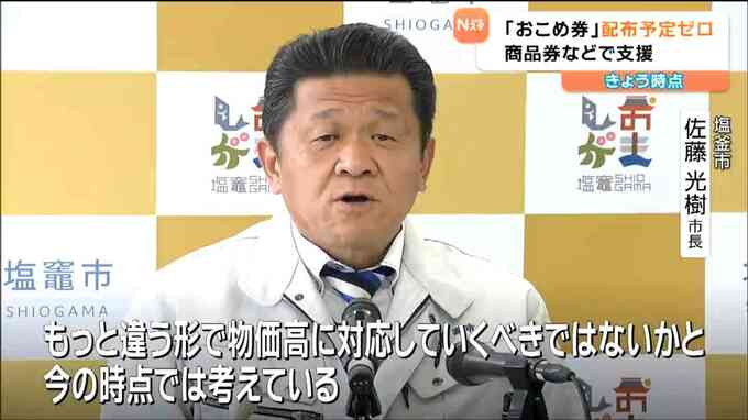 こうしたなか、塩釜市の佐藤光樹市長は会見で「おこめ券」の配布は「今のところ予定していない」と回答しました。