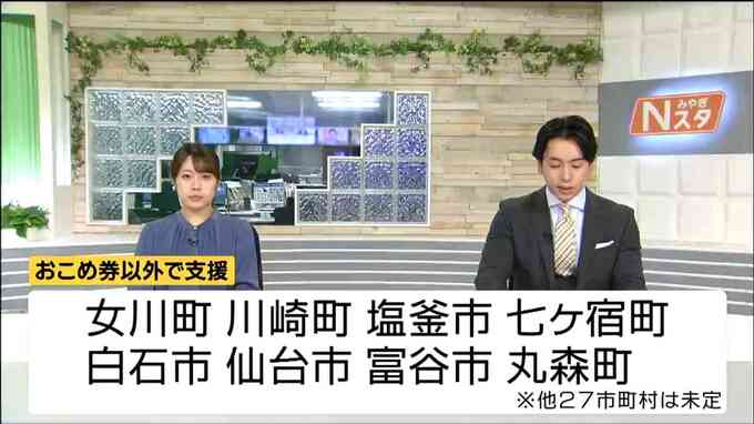 交付金の活用方法について仙台市や塩釜市、富谷市など8の市と町は「おこめ券」ではない商品券や電子クーポンなどを選択する見込みで、ほかの27市町村は検討中または未定だということです。