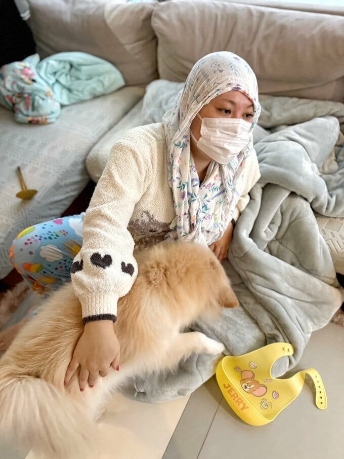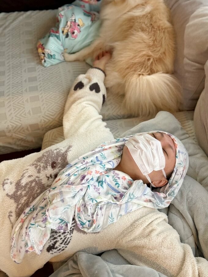 またベッドに愛犬の神ちゃんとともに寝ている画像を添えて、「同時に体調不良だった娘も復活したと思った矢先、今度は神ちゃんがお腹を壊しています。」と、愛犬まで体調を崩したことを明かしました。