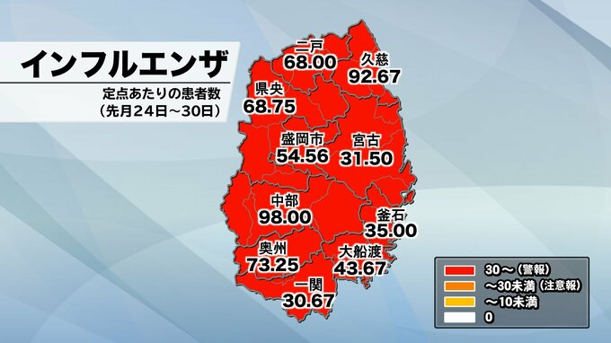 保健所別にみると中部が98.0人、久慈が92.67人と100人に迫っているほか、県内全ての保健所管内で警報レベルを上回っています。