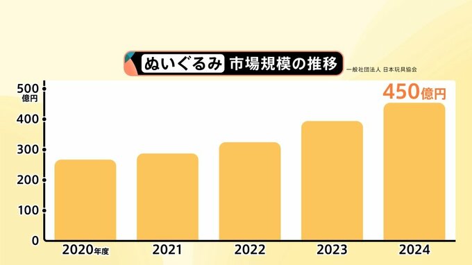 実は、ぬいぐるみの市場規模は年々拡大していて、2024年は約450億円と過去最高を記録しています。(一般社団法人 日本玩具協会より)