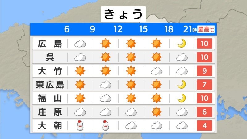 雪のピークは過ぎましたが、上空の寒気は残り、北部ではあすまでしぐれる見込みです。南部では、次第に日差しが届きますが、気温は上がりにくくなっています。予想最高気温は、広島・呉・福山で10℃、庄原6℃です。県内各地で、路面の凍結のおそれがあります。トンネルの出入り口付近、橋の上などは、特に注意してください。