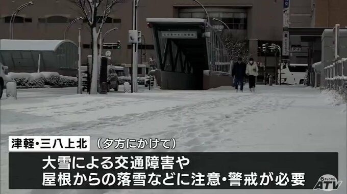 津軽と三八上北では、夕方にかけて大雪による交通障害や屋根からの落雪などに注意・警戒が必要です。