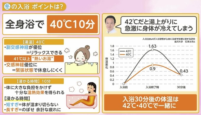 実は入浴30分後の体温は、40℃の入浴でも42℃の入浴でも一緒です。湯あがりに急激に体を冷やさないためにも、ほどほどの40℃がベストです。