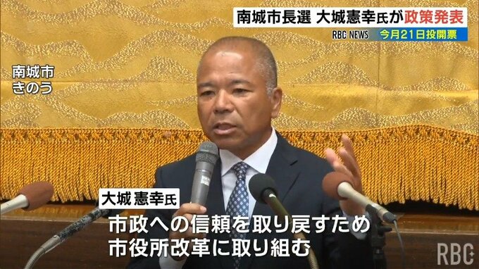 前市長の失職に伴い今月21日に実施される南城市長選挙に向け、元県議の大城憲幸さんが基本政策を発表しました。
