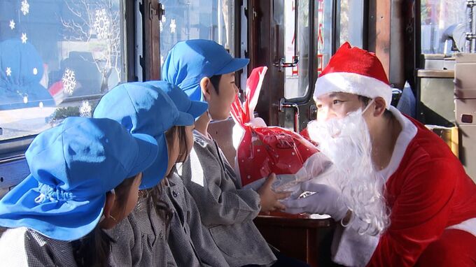 今年も路面電車がクリスマスムードを盛り上げます。岡山市街地を走る「クリスマス電車」の運行が始ました。(一坪花音アナウンサー)「こちら、岡山電気軌道の路面電車“KURO”です。上を見てみますと、リースなど…
