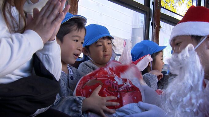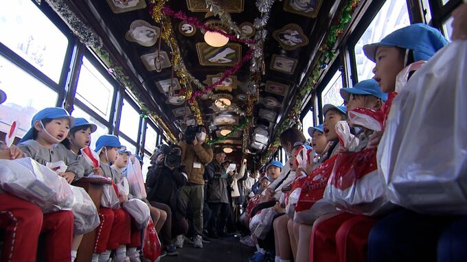 岡山電気軌道がクリスマスシーズンにあわせて30年以上続けているクリスマス電車です。運行開始のセレモニーには約20人の園児が参加し、サンタクロースから少し早めのプレゼントを受け取りました。