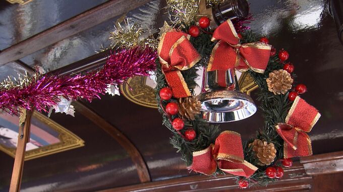 「こちら、岡山電気軌道の路面電車“KURO”です。上を見てみますと、リースなどクリスマス仕様に包まれています」