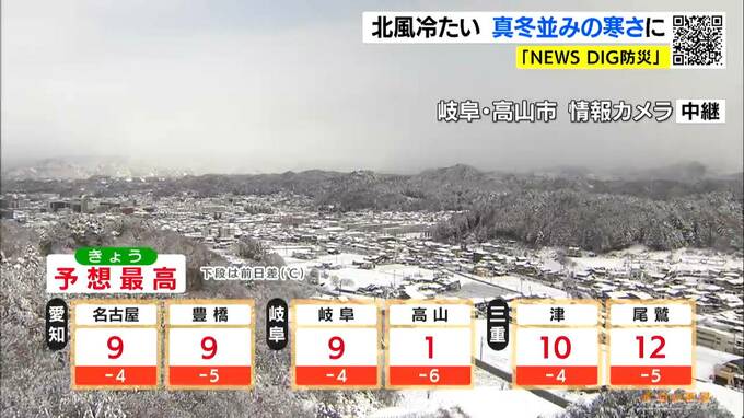 最高気温は名古屋や豊橋、岐阜で9度、高山で1度、尾鷲で12度くらいになるでしょう。沿岸部を中心に風が強まりやすく、日中も真冬並みの寒さになる所がありそうです。