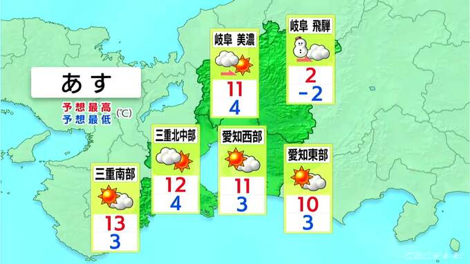あすです。平野部は晴れる所が多いでしょう。岐阜県山間部はあすにかけて雪が降り、積雪の増える所もある見込みです。予想最高気温は名古屋や岐阜で11度と、寒さが続くでしょう。