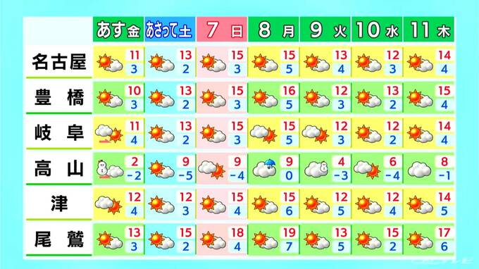 週間予報です。週末は山間部を含めて晴れるでしょう。日曜日は平年よりも気温がやや高くなる予想です。朝晩は冷え込みが強まるため、一日の寒暖差にはご注意ください。来週も平野部では晴れる日が多いでしょう。岐阜県山間部は再び雪の降る日がありそうです。天気や気温の変化にはご注意ください。