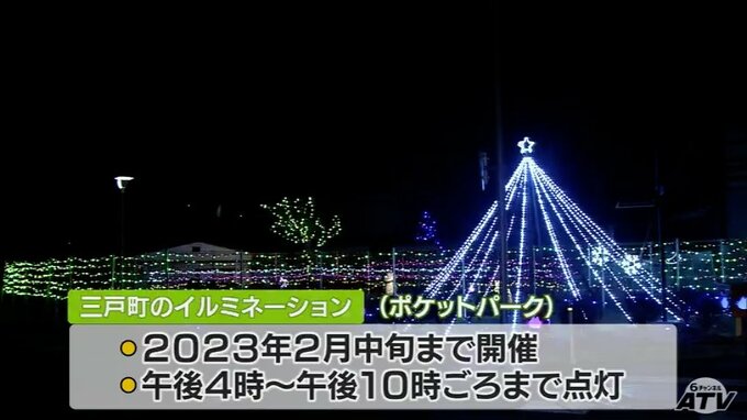 三戸町のポケットパークのイルミネーションは2023年2月中旬まで開催され、午後4時から10時頃まで点灯しています。