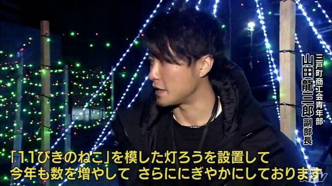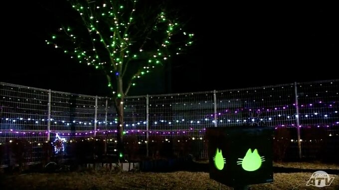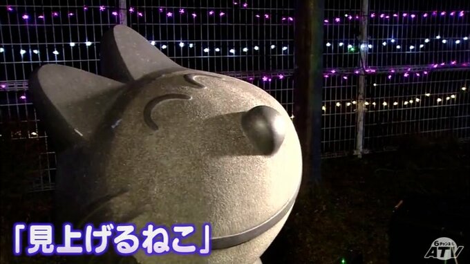 三戸町では、約1万2000個の光りが鮮やかに輝いています。町出身の漫画家・馬場(ばば)のぼるさんの代表作「11ぴきのねこ」に登場するシーンの石像がイルミネーションを見上げ、幻想的な雰囲気を楽しんでいます。