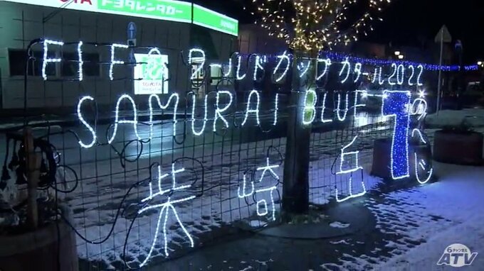 野辺地駅前と駅前から続く約2.2キロの通りが青や白、金色の光りで彩られています。今年は、ワールドカップカタール大会に日本代表として選ばれた町出身の柴崎岳選手を応援するイルミネーションも設置されました。