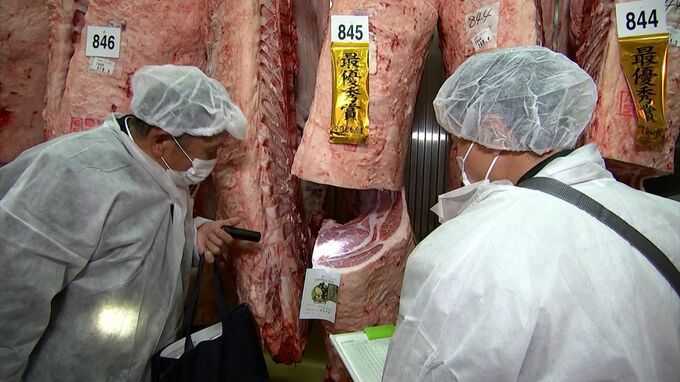 岡山県内の畜産農家が生産した牛肉や豚肉の出来を競う「枝肉共進会」が岡山市中区で開かれました。審査員が肉質や食べられる部分がどれくらいあるかなどを確認していきます。