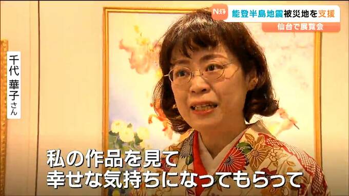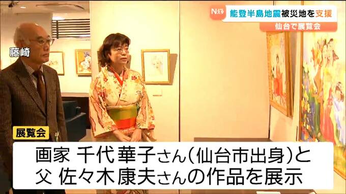 仙台市青葉区の百貨店・藤崎で4日から始まった展覧会では、仙台市出身の画家、千代華子さんと、父・佐々木康夫さんの作品が並んでいます。イギリスで絵画を学んだ千代さんは2007年から8年間、石川県で暮らし、東日本大震災の発生後にはふるさとを支援しようと金沢でチャリティー展を開催しました。