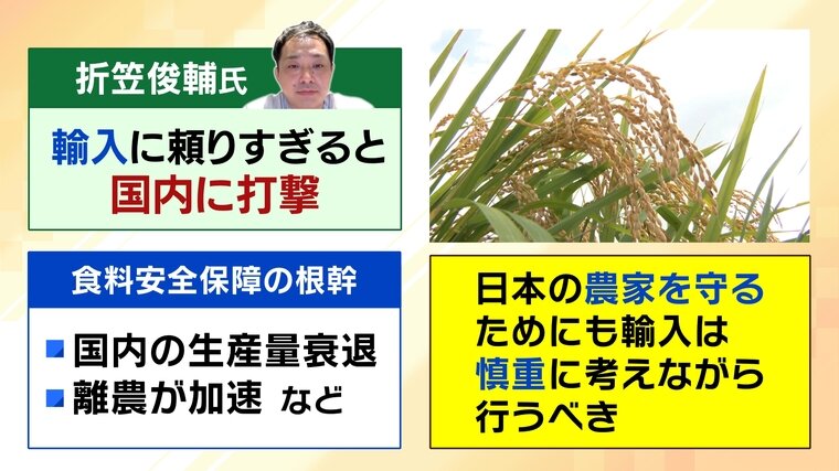 一方、流通経済研究所の折笠俊輔氏は「輸入に頼りすぎると国内に打撃」と指摘。食料安全保障の観点から、国内の生産量衰退や離農の加速などを懸念しています。日本の農家を守るためにも、輸入は慎重に考えながら行うべきだという意見です。