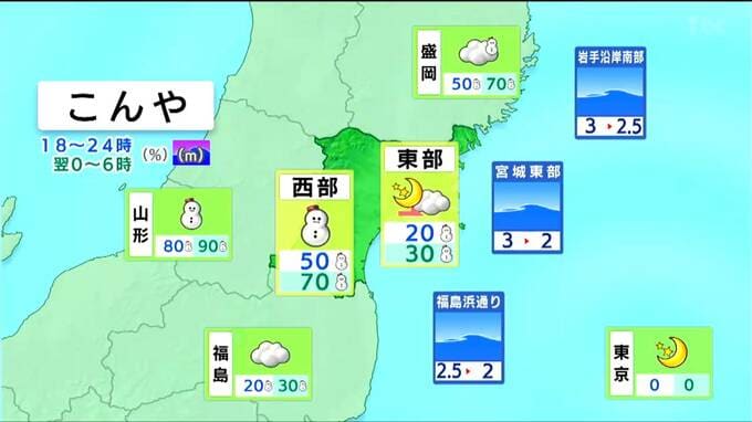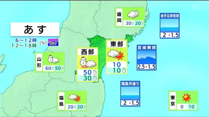 東部では明け方まで広く雪が降り、平地でも積雪が増えるおそれがあります。西部は昼前まで雪が降り、昼過ぎからは曇りでしょう。
