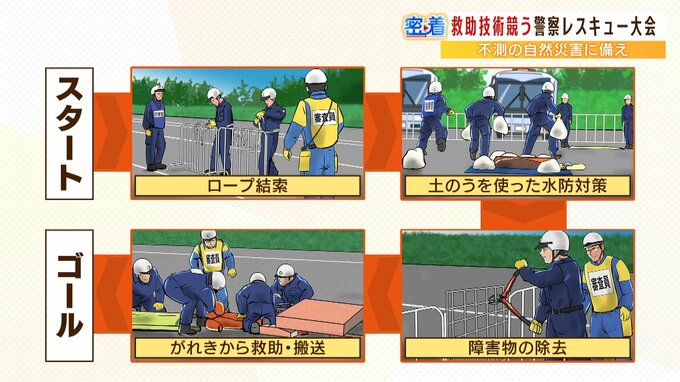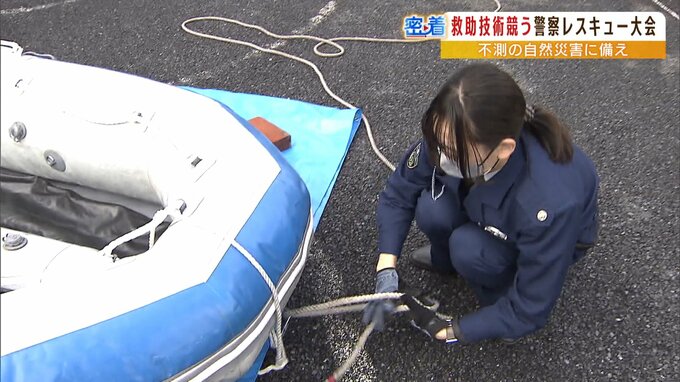 大会では、水害を想定したロープの結索や土のうを使った防水作業のほか、地震を想定した障害物の除去やがれきの下敷きになった人の救出搬送などをリレー形式で行います。その速さを競いますが、作業の正確性も審査対象です。