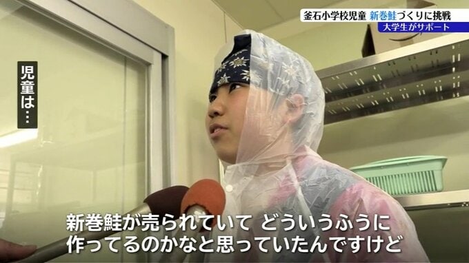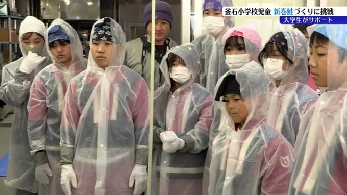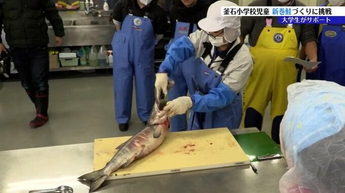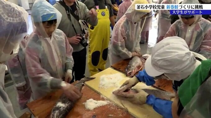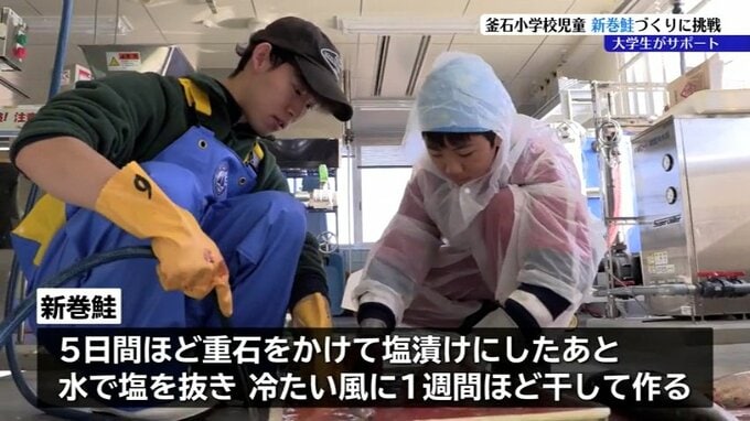 岩手県釜石市の小学生が大学生から手ほどきを受けて冬の風物詩、「新巻鮭」づくりに挑戦しました。